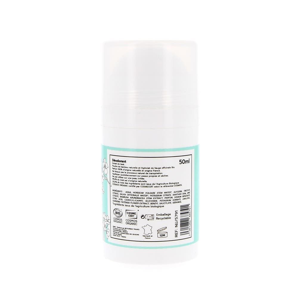 Le déodorant bio à petit prix Nijiko permet d'empêcher la formation des mauvaises odeurs sans bloquer le processus naturel de transpiration, nécessaire au corps pour réguler sa température et évacuer les toxines. Sa formule contient de l'hydrolat de sauge, aux propriétés anti-bactériennes et anti-fongiques qui inhibent le développement des odeurs, ainsi que de la poudre de bambou pour absorber les excès d'humidité.