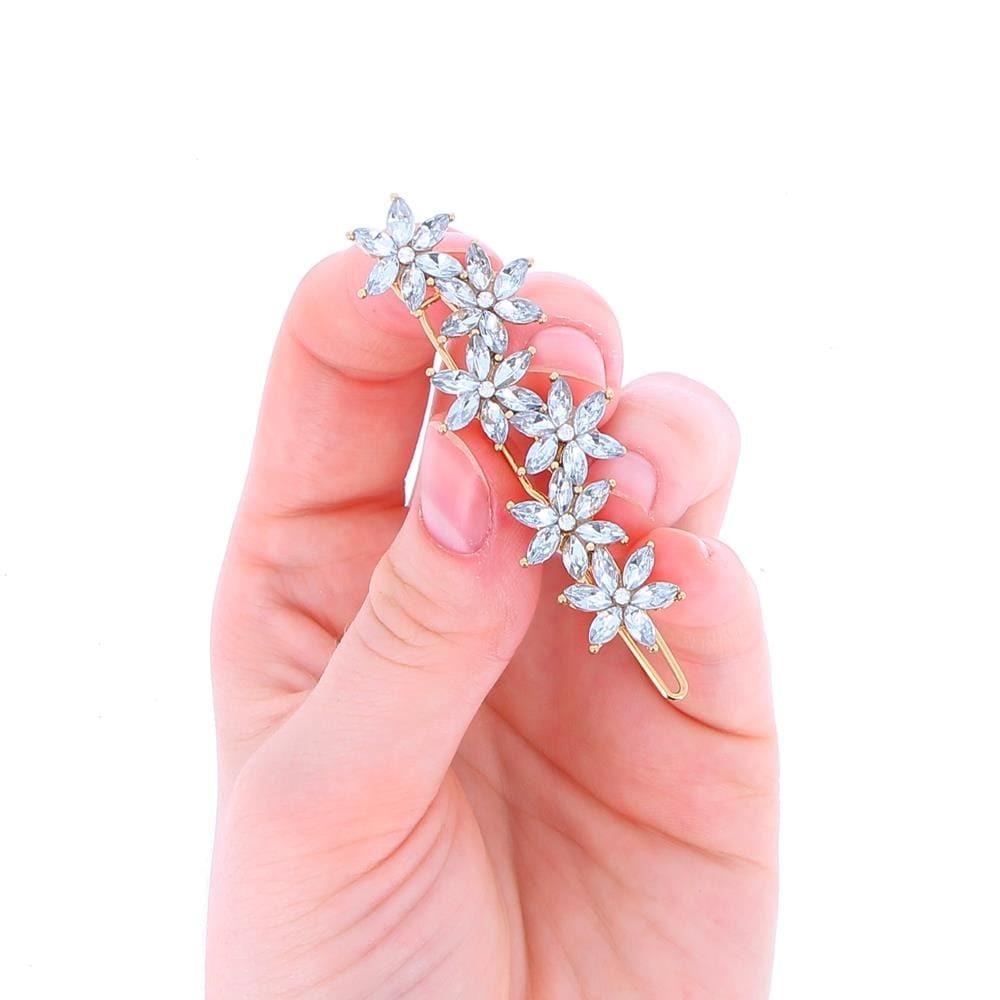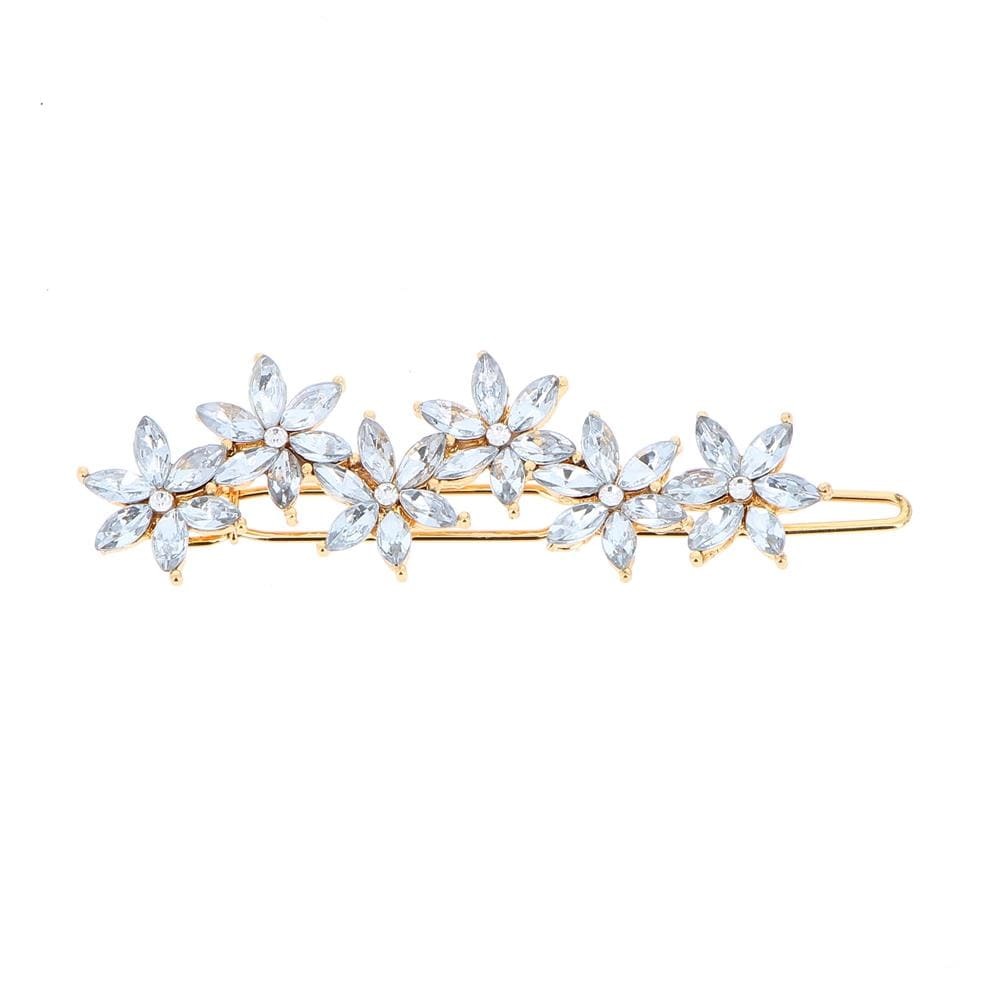 Idéale pour accessoiriser une tresse ou un chignon, cette petite barrette à cheveux dorée est rehaussée de fleurs en cristal scintillantes. Longueur : 6cm