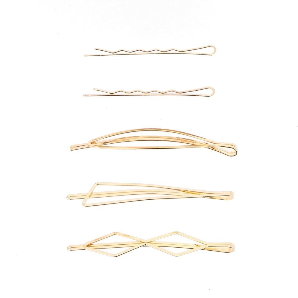 Proposé à prix mini, cet assortiment de 5 épingles à cheveux en métal doré permettra d'accessoiriser votre chevelure avec des formes géométriques minimalistes et tendance. Longueurs : 5,5 et 7 cm