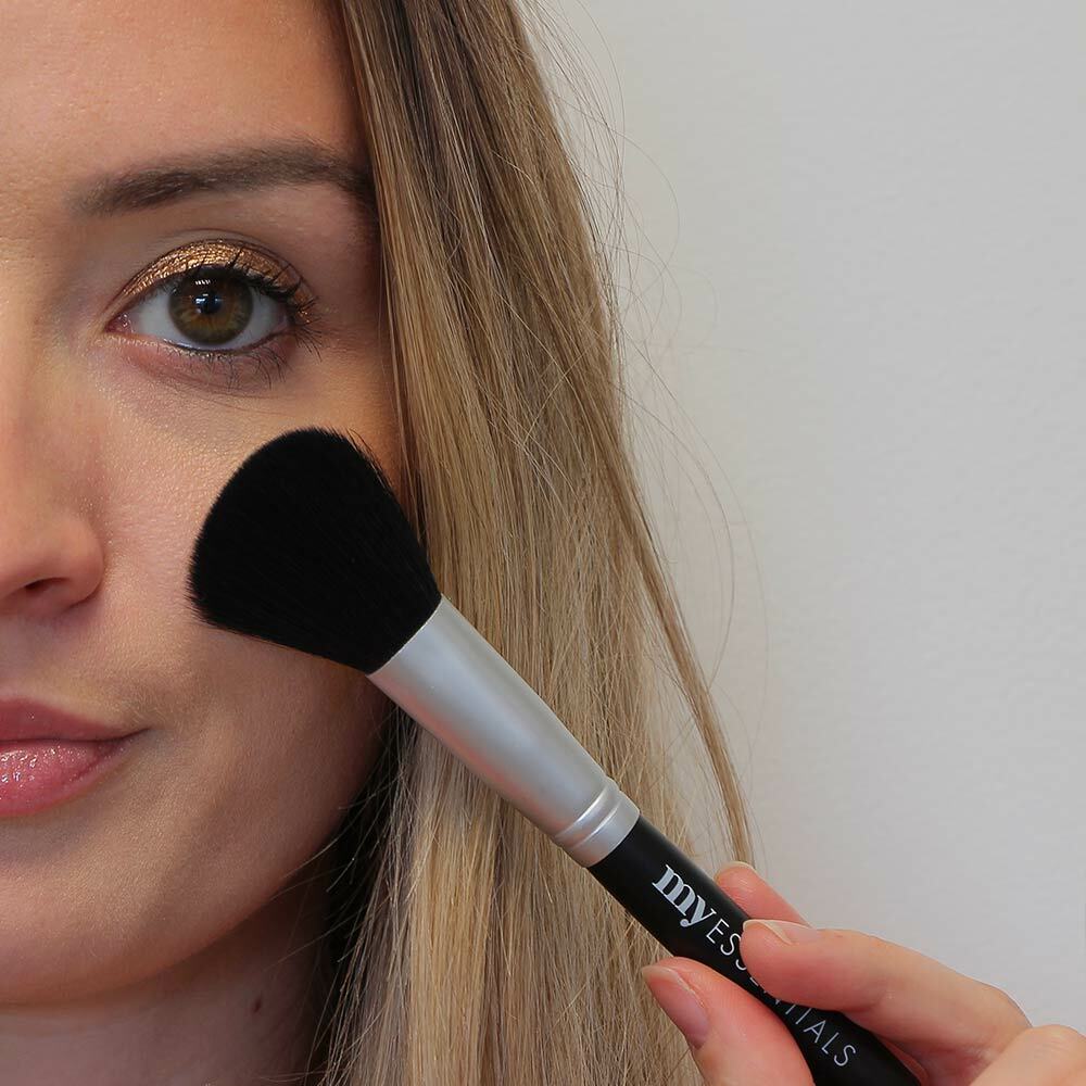 Prélevez un peu de blush, de poudre bronzante ou de fard illuminateur à l'aide de votre Pinceau Blush Essentiel, puis déposez la matière sur les pommettes et/ou les autres zones bombées (front, nez, menton, contours du visage, décolleté...), en fonction de l'effet recherché.