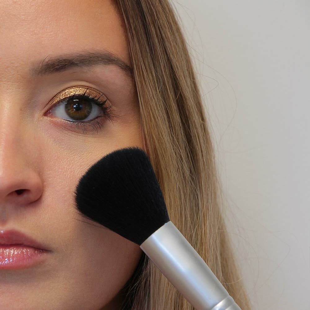 Prélevez un peu de votre poudre sur votre pinceau en prenant soin d'enlever l'excédent en soufflant dessus. Appliquez ensuite de manière uniforme votre poudre sur l'ensemble de votre visage. Pour un effet bonne mine, terminez par un peu de poudre de soleil BYS sur vos pommettes.