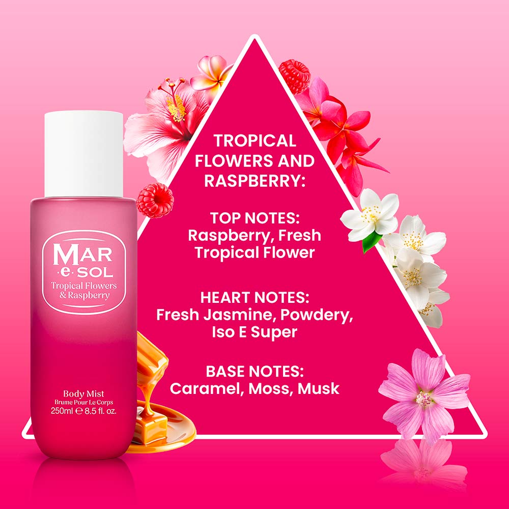 Fruité, floral, enivrant : la Brume Corporelle Mar e Sol – Framboise, Jasmin, Musc est une explosion de sensualité douce et pétillante, pensée pour celles qui veulent laisser un sillage à la fois frais, tendre et captivant. Cette fragrance marie l’éclat juteux de la framboise, l’élégance florale du jasmin et la douceur réconfortante du musc. Ultra légère mais résolument addictive, elle se vaporise sur le corps, les cheveux ou les vêtements pour une touche de fraîcheur glamour à tout moment de la journée. Fraîche, féminine, irrésistible : le parfait équilibre entre douceur et séduction.Conseils d'utilisation