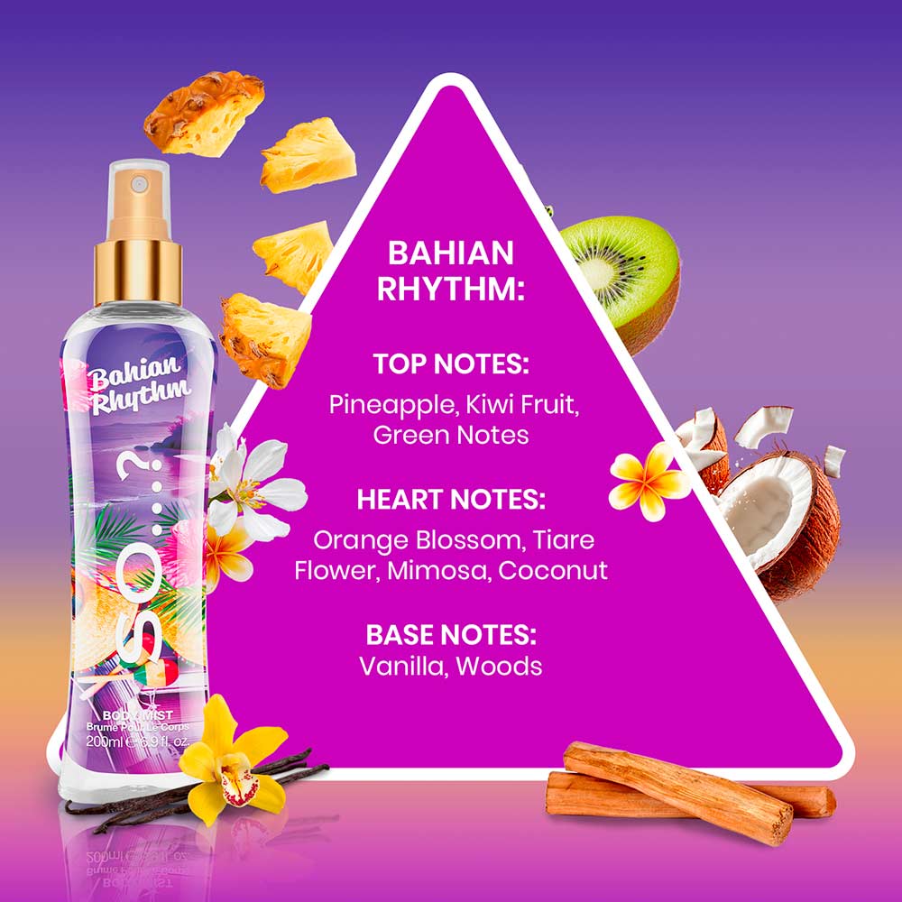 La Brume Corps Bahian Rhythm transporte vos sens au cœur des tropiques avec ses notes exotiques de fruits frais et de fleurs envoûtantes. Un parfum vibrant et ensoleillé qui vous enveloppe d'une énergie chaleureuse et vivifiante.Conseils d'utilisation