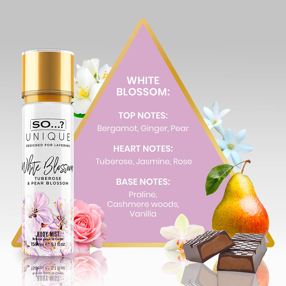 Laissez vous séduire par la brume SO Unique White Blossom, cette fusion délicate entre la fraîcheur juteuse de la poire mûre et la vivacité pétillante de la bergamote crée une expérience olfactive rafraîchissante et dynamique.Conseils d'utilisation