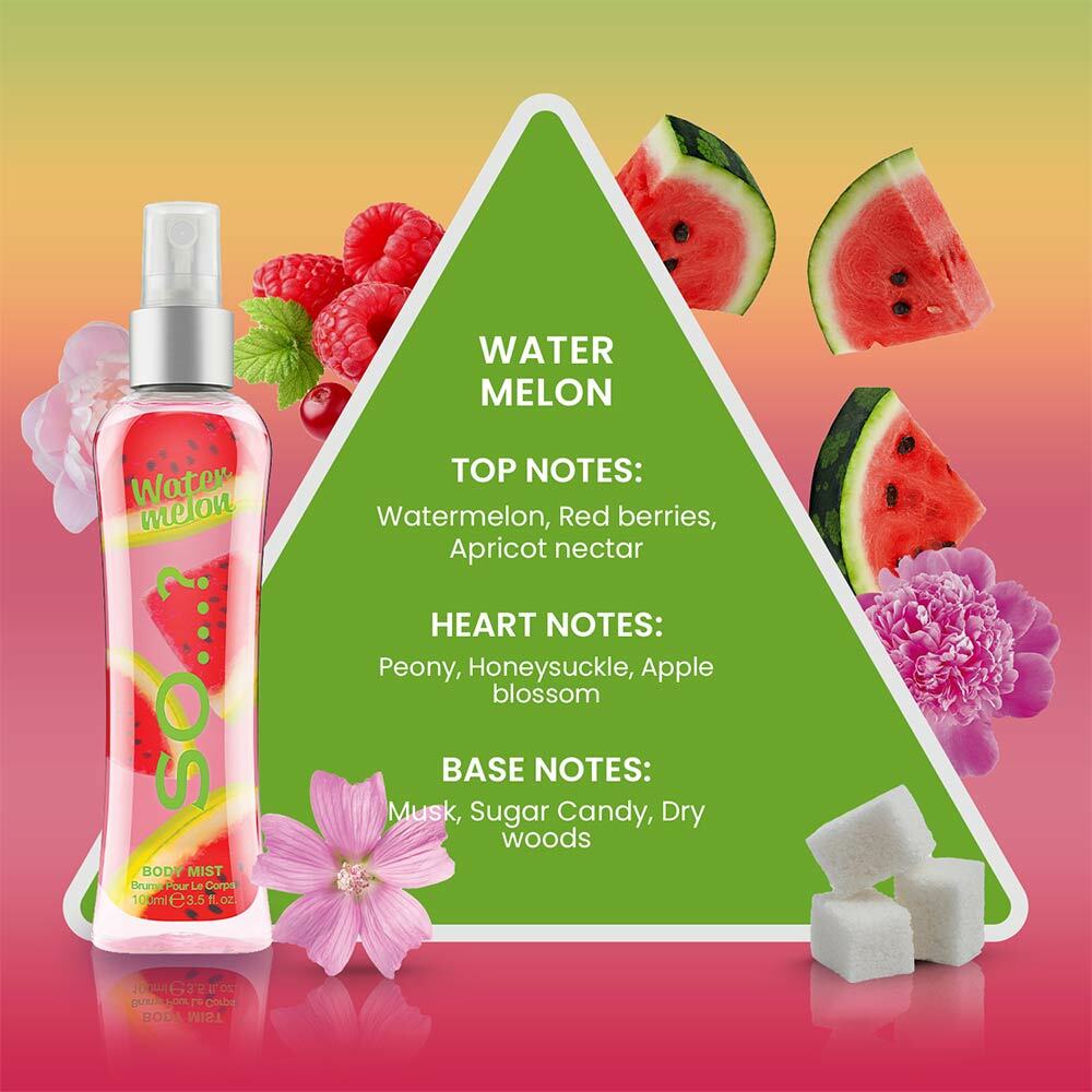 Donnez-vous l'eau à la bouche avec cette brume fruitée de la marque SO...? Son cœur à la pastèque est rehaussé de notes de fruits rouges et de fleur de pommier pour un cocktail au parfum très frais et printanier, idéal pour les beaux jours.Conseils d'utilisation