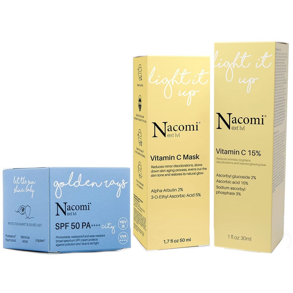 - Le Sérum Éclat Light It Up - Vitamine C 15% : il contribue à nourrir et repulper l'épiderme en lui apportant un boost de nutriments. Votre peau devient plus lisse et uniforme et votre visage visiblement plus radieux.