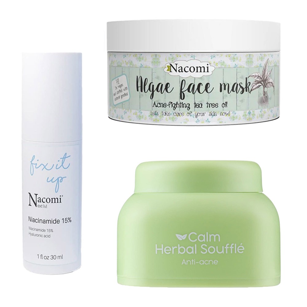 - La Crème Anti-Acné Herbal Soufflé, à appliquer après votre sérum, contient un coctail d'actifs anti-acné comme le chou kale et de l'huile de jojoba aux propriétés rééquilibrantes pour réguler la production de sébum, ainsi que de la niacinamide améliorant l'aspect des pores et diminuant les imperfections.