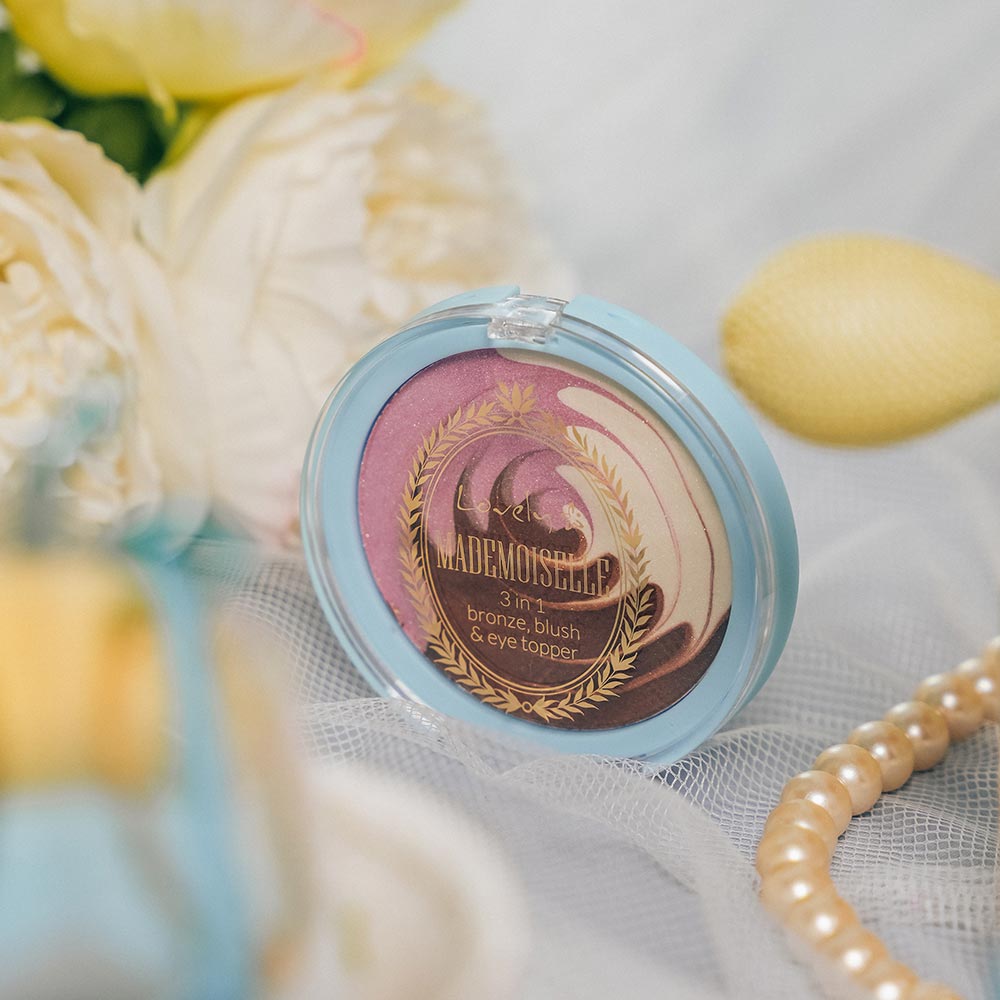 Le Fard 3-en-1 *Mademoiselle Edition* de LOVELY est un allié beauté polyvalent qui rehausse le teint, sculpte les traits et illumine le regard. Sa formule douce et soyeuse, enrichie en mica et en poudres réflectrices de lumière, offre un fini lumineux modulable selon l’intensité souhaitée. Utilisé en bronzer, il réchauffe subtilement le teint ; en blush, il apporte une touche de fraîcheur colorée ; et sur les paupières, il dépose un voile irisé pour un regard éclatant. Sa texture fine glisse sur la peau sans marquer les pores ni les ridules, assurant un résultat homogène et confortable. Délicatement parfumé, ce fard cuit s’adapte à toutes les carnations pour un effet bonne mine élégant et naturel en un seul geste.Conseils d'utilisation
