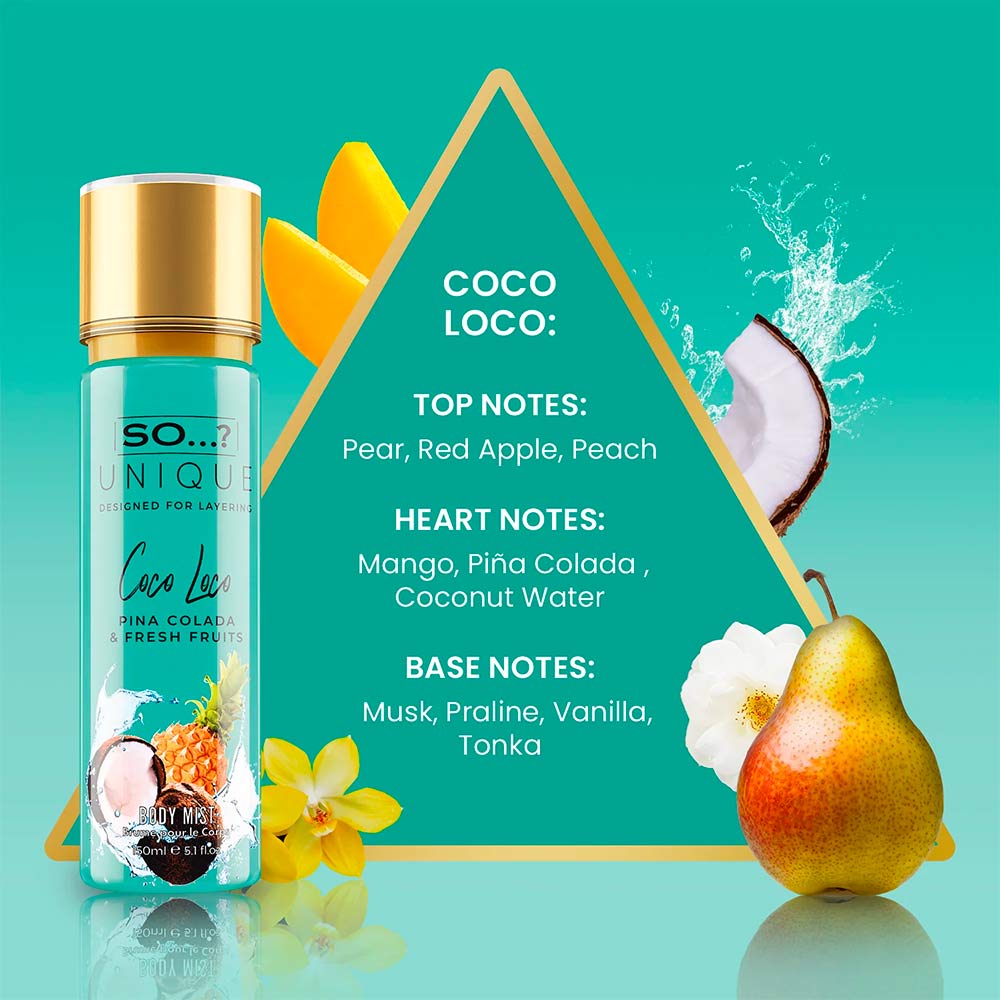 Donnez vous l'eau à la bouche avec cette Brume Corps So Unique Coco Loco: Son cœur à la mangue, eau de coco et ananas est rehaussé de notes de peche et de vanille pour un cocktail au parfum très frais gourmand !