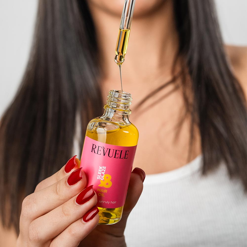 L’Huile Anti-Frisottis Sleek & Glaze de REVUELE est un soin capillaire sans rinçage conçu pour discipliner les cheveux indisciplinés et améliorer leur aspect au quotidien. Sa formule associe des huiles végétales reconnues, comme le macadamia, le jojoba, le lin et le tournesol, pour aider à nourrir les longueurs et à lisser visuellement la fibre capillaire. La vitamine E contribue à préserver la douceur et l’éclat des cheveux. Sa texture légère enveloppe les cheveux d’un voile lissant qui aide à limiter les frisottis et à apporter une brillance maîtrisée, sans alourdir. Utilisée régulièrement, cette huile aide à rendre les cheveux plus souples, plus disciplinés et agréables au toucher. Idéale en finition ou en soin quotidien, elle s’intègre parfaitement dans une routine dédiée aux cheveux rebelles ou difficiles à coiffer.Conseils d'utilisation