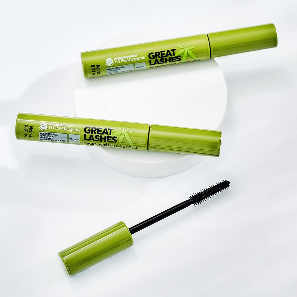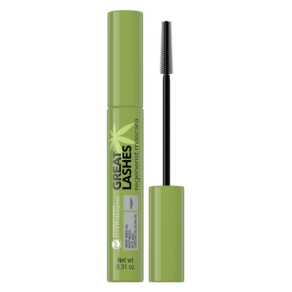 Le packaging du mascara Great Lashes est vert, avec un rappel de la plante de chanvre. C'est original et ça donne un côté green et clean au produit. La brosse en silicone est fine.