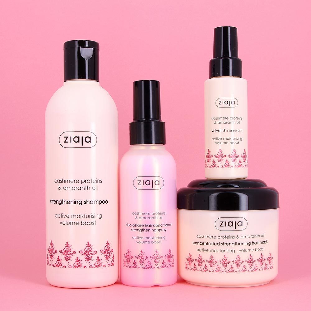 Combinant des extraits de cachemire, de la kératine végétale et de l'huile d'amarante, ce masque répare les longueurs abîmées et redonne de la densité aux cheveux naturellement fins ou affinés par les traitements (colorations, lissages, appareils chauffants...). Les protéines de cachemire et la kératine viennent combler les brèches entre les écailles tandis que l'huile d'amarante nourrit et réhydrate les cheveux sans les alourdir. Au fil des utilisations, les cheveux retrouvent plus de vigueur et de tenue, avec un aspect brillant et un agréable toucher soyeux.