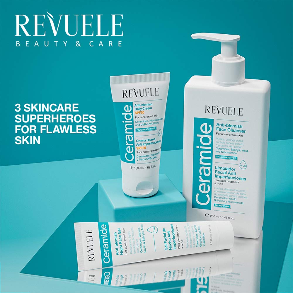 Le Soin Jour Anti-Acné SPF 50 à la Céramide protège votre peau des agressions extérieures tout en combattant les imperfections. Sa formule innovante hydrate, régule l'excès de sébum et renforce la barrière cutanée, offrant ainsi une protection solaire optimale et un teint purifié tout au long de la journée. La gamme visage CERAMIDE Anti-Blemish offre une solution complète pour les peaux sujettes aux imperfections. Enrichie en céramides, elle renforce la barrière cutanée, hydrate en profondeur et régule l'excès de sébum. Résultat : une peau plus nette, apaisée et protégée, avec un teint plus uniforme et sans imperfections.