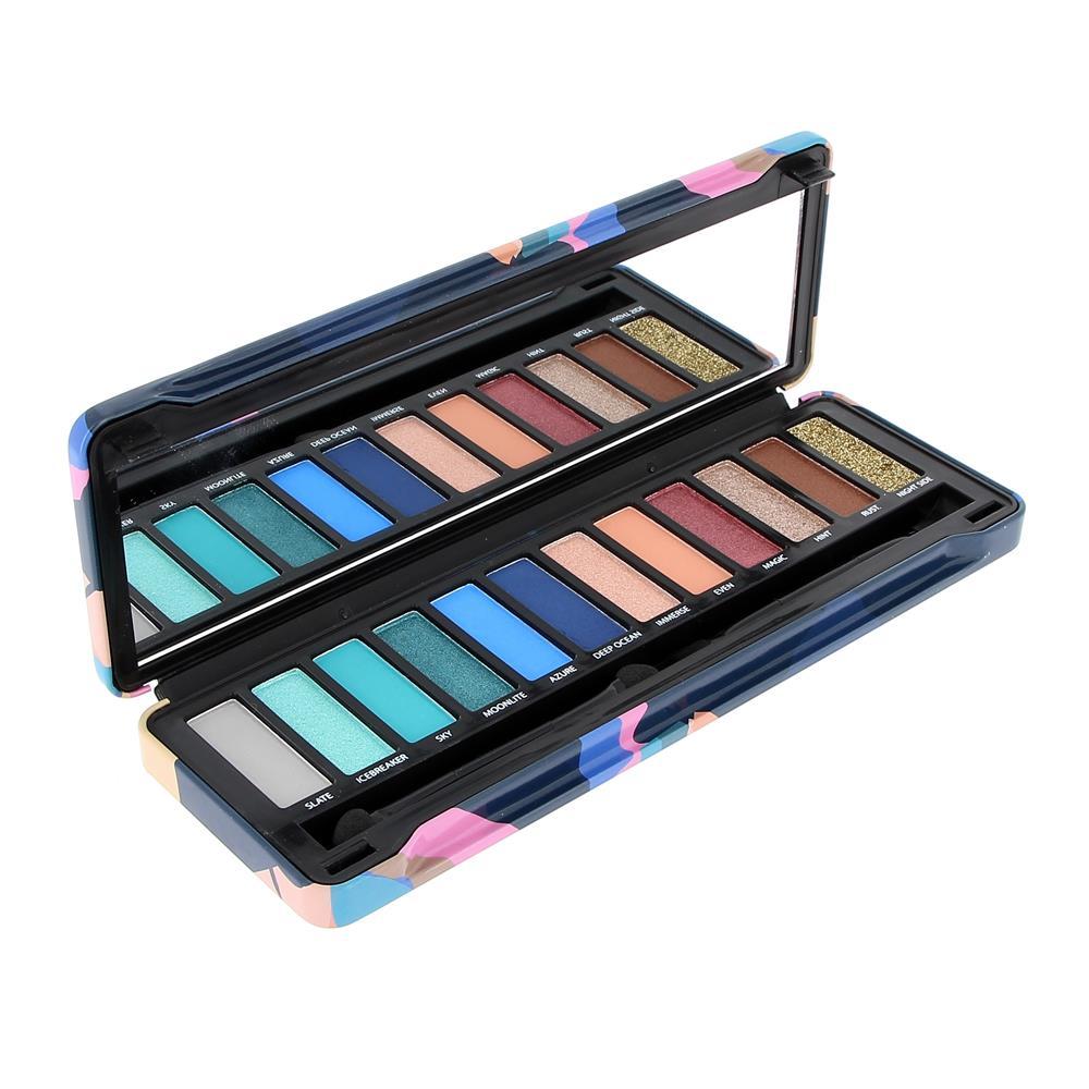 D'un côté, 6 fards froids en dégradé de bleus et de turquoises avec 4 finis mats et 2 fards irisés.