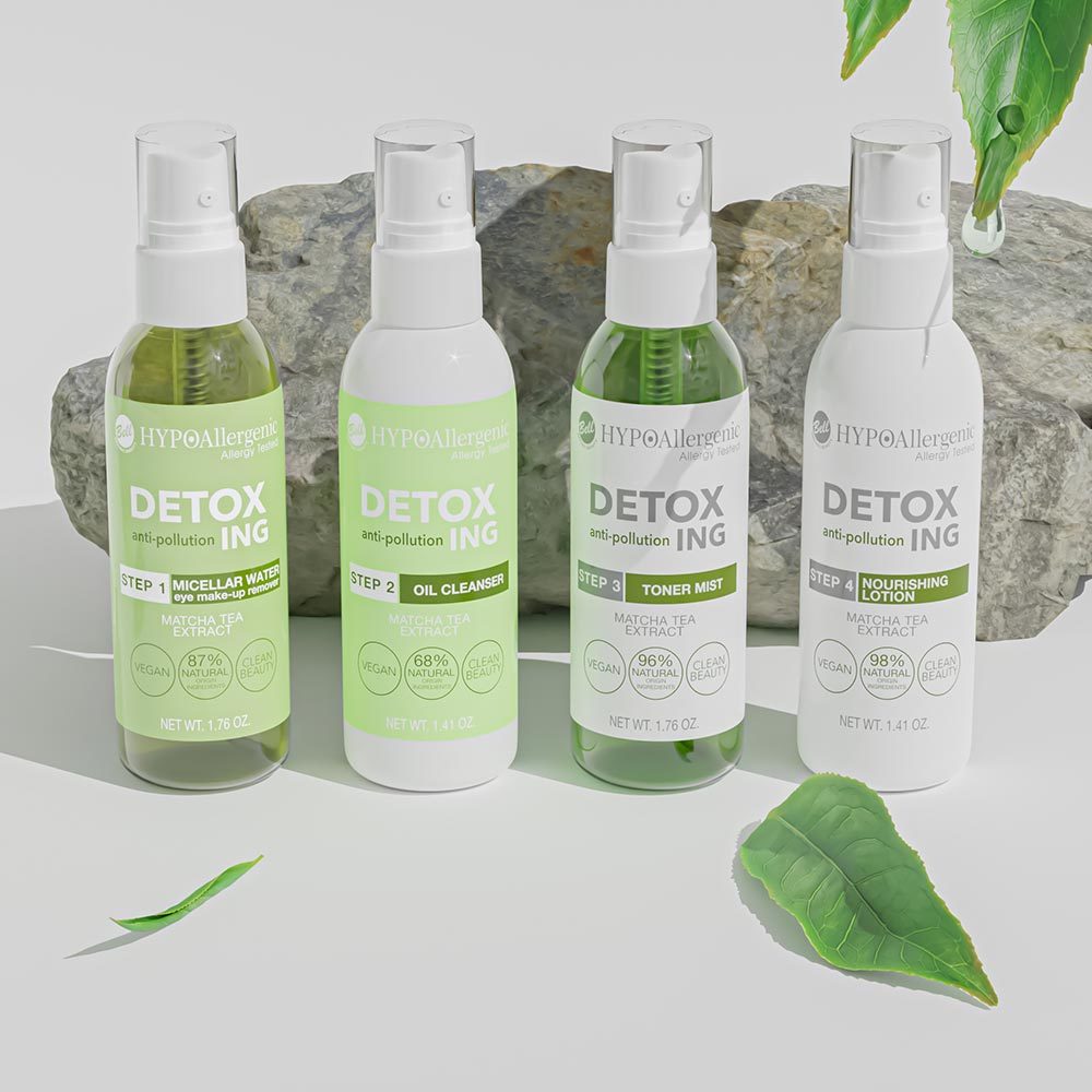 Le tonique Detoxing combine ainsi du matcha avec des actifs hydratants comme l'acide hyaluronique, la glycérine végétale et le gel d'aloe vera pour neutraliser l'effet asséchant de l'eau calcaire et prévenir les tiraillements et les rougeurs. Il renferme également de la niacinamide qui renforce la barrière cutanée, améliore l'élasticité de la peau et accentue l'éclat du teint.