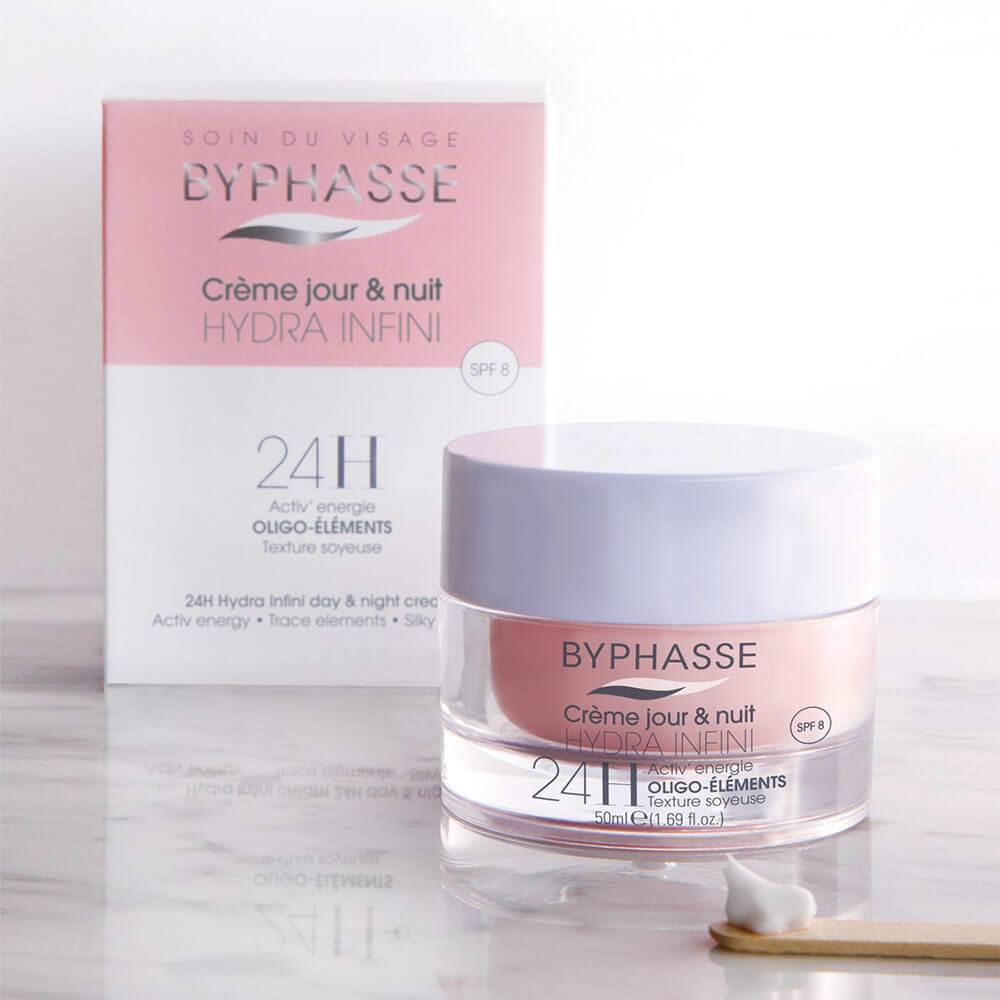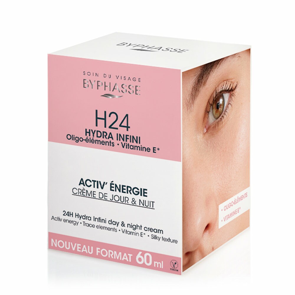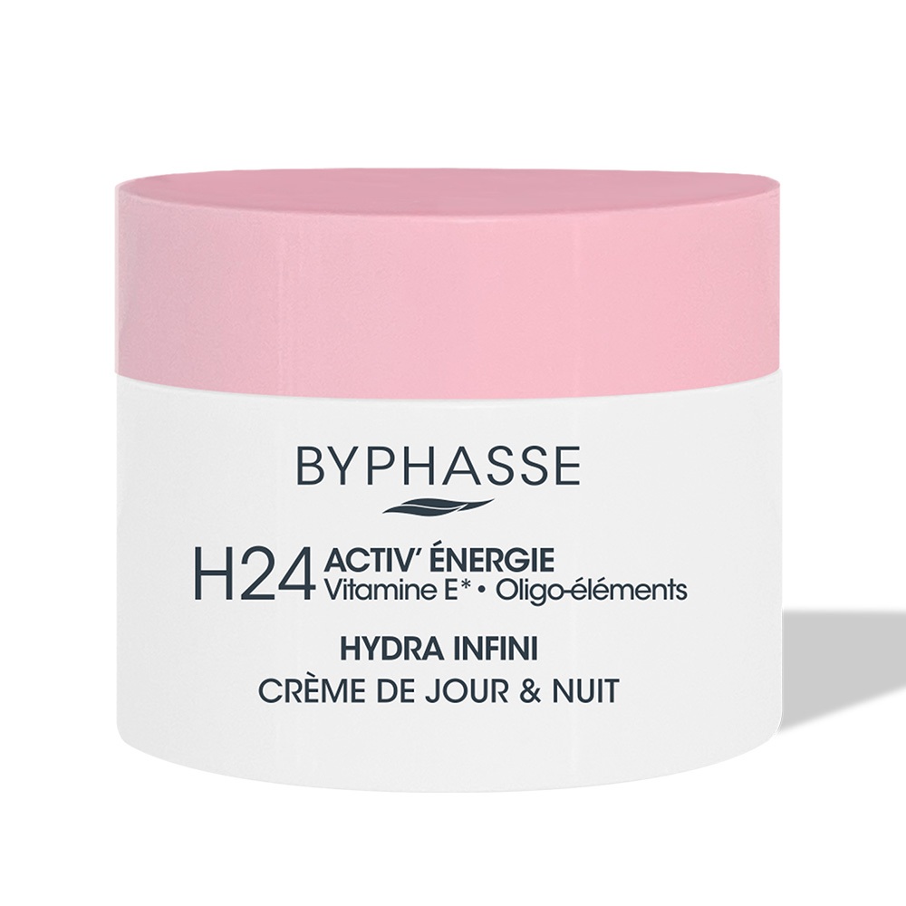 Hydratez en profondeur et durablement votre épiderme avec la Crème Jour & Nuit 24h Hydra Infini Byphasse et son association d’oligo-éléments, minéraux indispensables qui renforcent l’énergie et le bon fonctionnement des cellules cutanées. Une peau douce et hydratée pendant 24h.